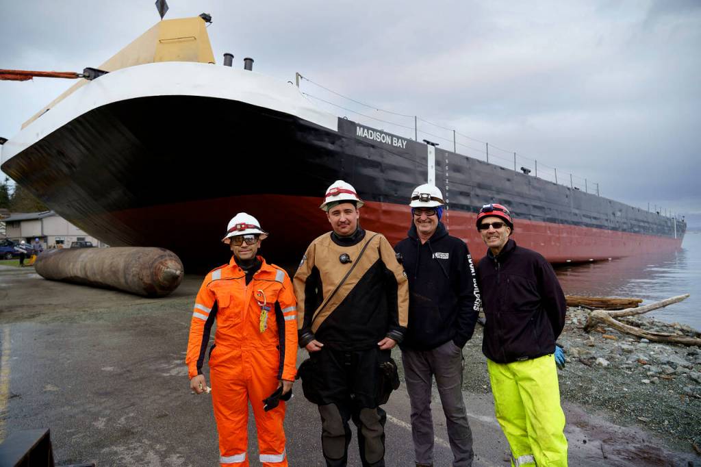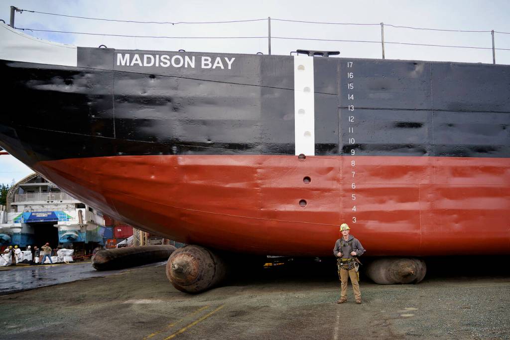Last Thursday, the Nichols Brothers Boat Builders crew moved the Madison Bay, a 1,700-ton, 286-foot-long and 76-foot-wide barge. The boat had been under Nichols Brothers’ care for a few months to undergo some repairs before slowly rolling back into the sea, aided by a series of giant, inflatable rubber sausages. Photographer David Welton was among curious community members who stopped by to take a peek.