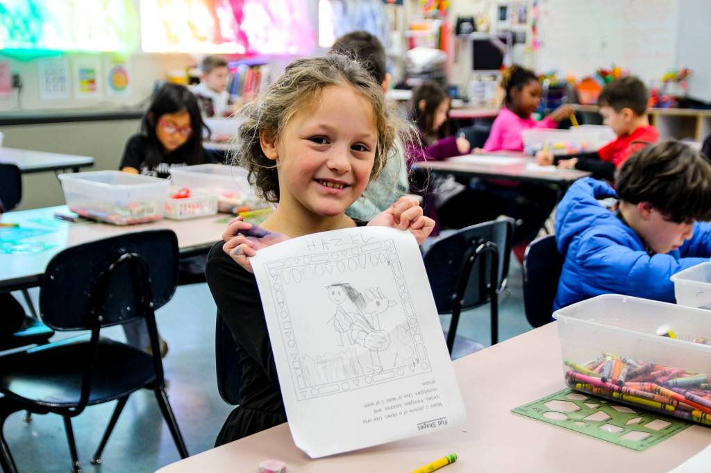 First grader Hazel Bratt, a student in Rachal Marcus’ art class, shows her Moana drawing.