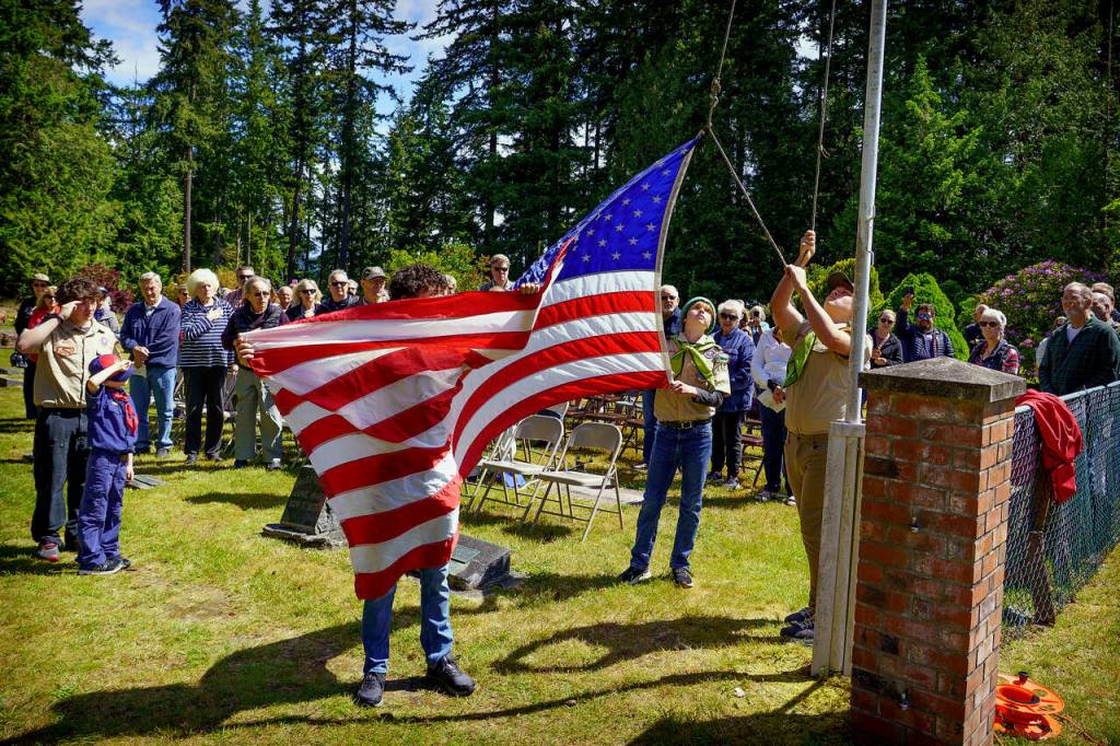 Boy Scouts raise the flag during the ceremony at the Clinton cemetery.
