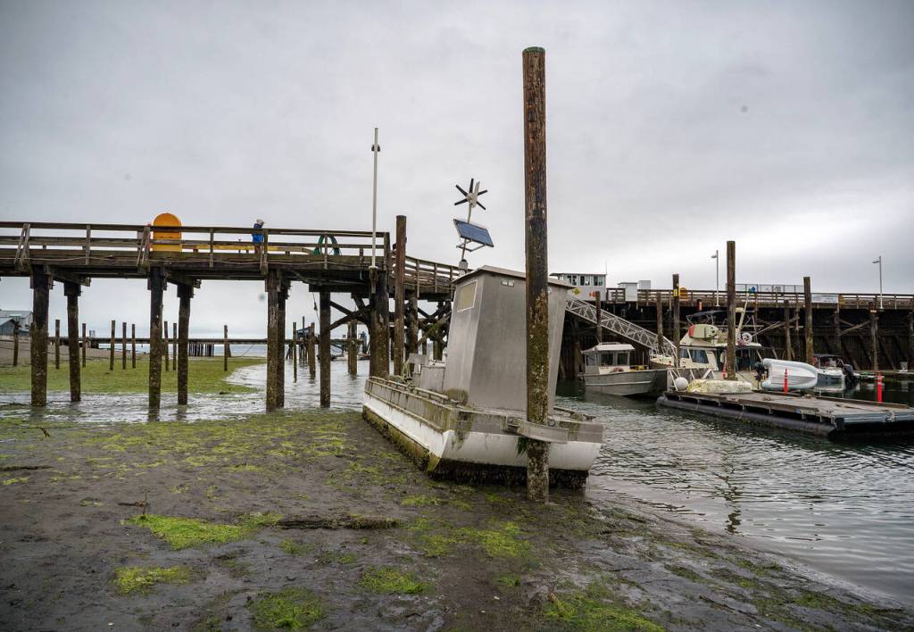 A maintenance boat at the Langley Marina was left high and dry during the low tide. This week, Whidbey Island experienced the lowest tides of the year, making it a perfect time to explore the mudflats.