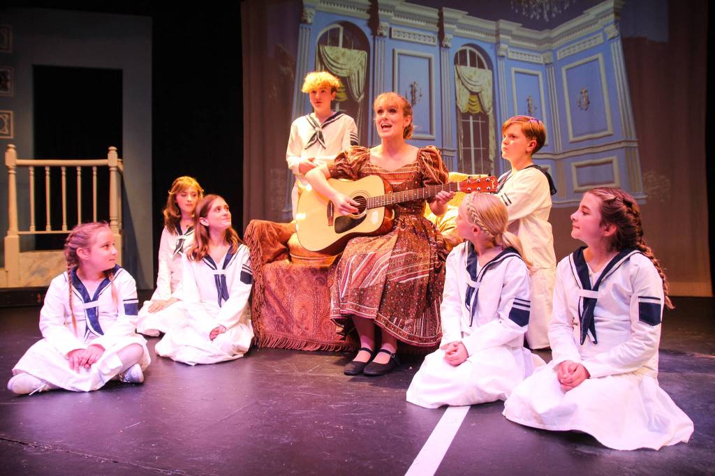 Maria (Karina Andrew) strums the guitar surrounded by the von Trapp siblings. From left are Luna Strong, Hannah Mayne, Lexi Thuet, Cillian Burke, Karina Andrew, Rowan McDonald, Sunny Thuet and Evie Christie. (Photo by Luisa Loi)