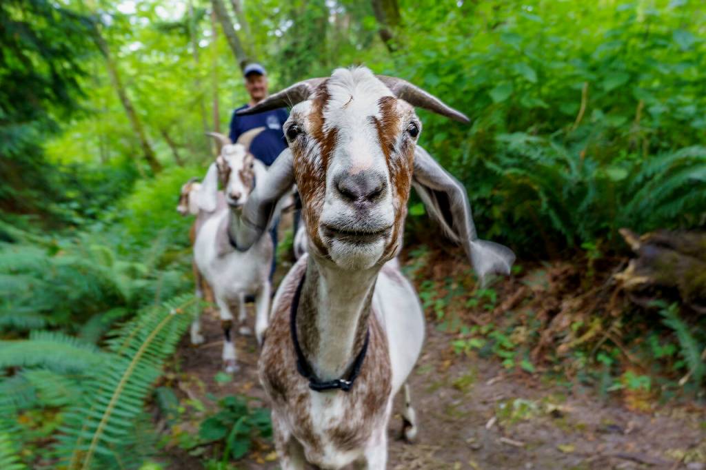 On an overcast but humid July day, five Nubian pack goats brazenly led the way up the steep and winding Dorothy Cleveland Trail on South Whidbey, guiding three humans deeper into the forest.