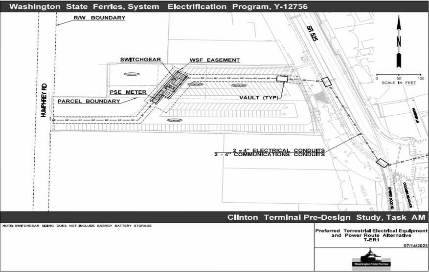 Binschus said PSE will put power underground into a joint utility trench along the highway, roughly 2.8 miles from the substation to the ferry parking lot. State Ferries is asking permission from the port commissioners to use parts of the parking lot for electrical equipment, known as the switchgear. The final design is not yet complete but Binschus estimated the footprint to be around 3,000 square feet or less.