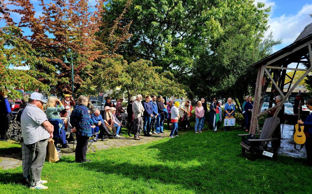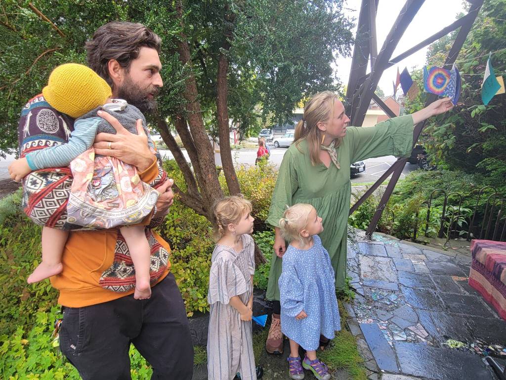 A family visiting Langley Park on Sunday admires a set of prayer flags. Over 50 people turned up for an interfaith vigil for Gaza on Sept. 21, which was the International Day of Peace. In attendance were members of the Jewish community, as well as those part of the Whidbey Island Friends Meeting, Langley United Methodist Church, Unitarian Universalist Congregation of Whidbey Island, St. Augustine’s in-the-Woods Episcopal Church and Trinity Lutheran Church. The event featured Palestinian music and poetry, interfaith prayer readings and the recitation of the names of children killed in Gaza.