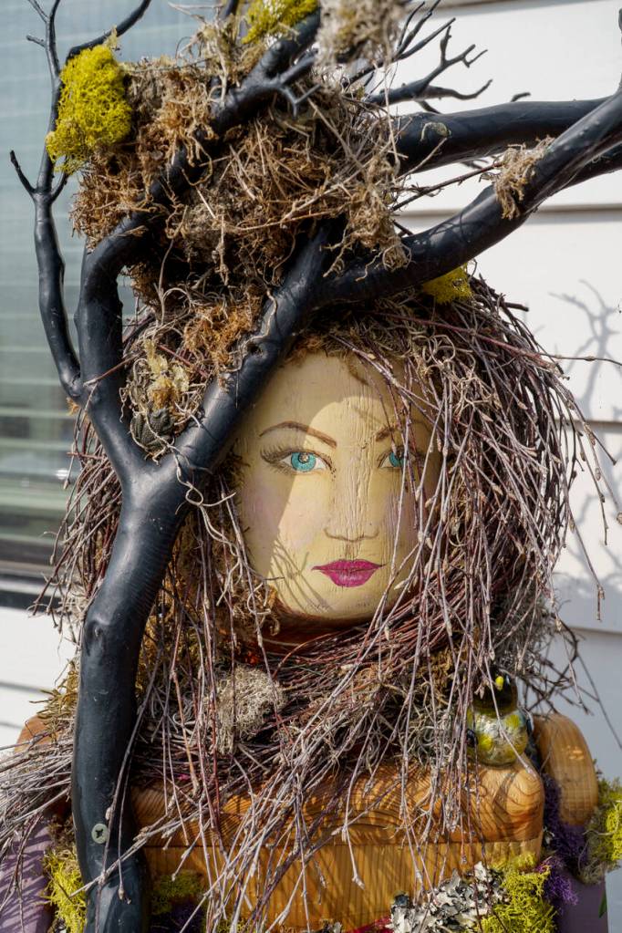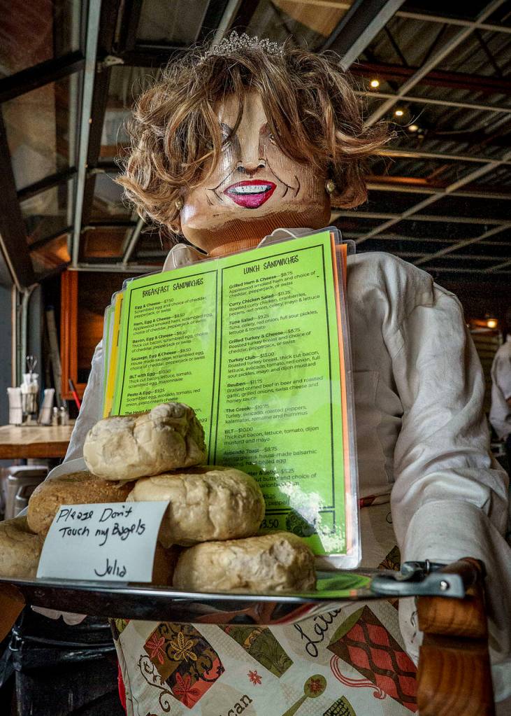 Auburn’s sister sewed the clothes for his Woodbey, and one of his customers in Coupeville painted the face. Auburn added a wig and bubble wrap to round out the figure’s curves. A humorous, handwritten sign implores patrons not to touch the bagels on her platter, which won’t taste very good after sitting out for so long.