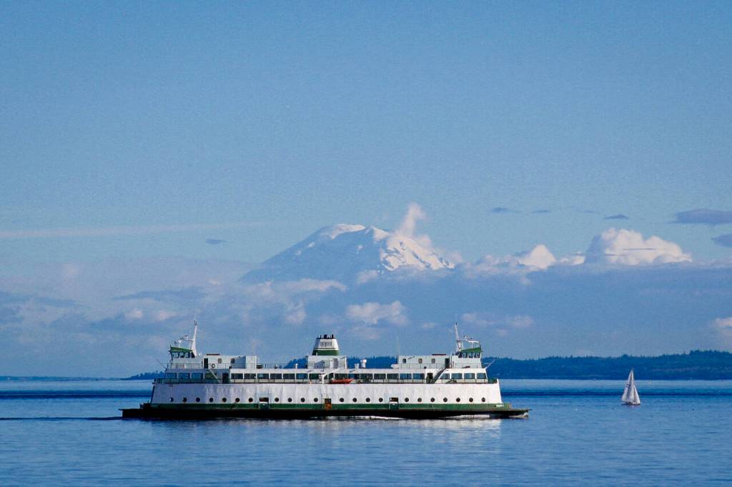 (Photo by David Welton) A ferry on the Coupeville-to-Port Townsend route cruises with Mount Rainier in the background.