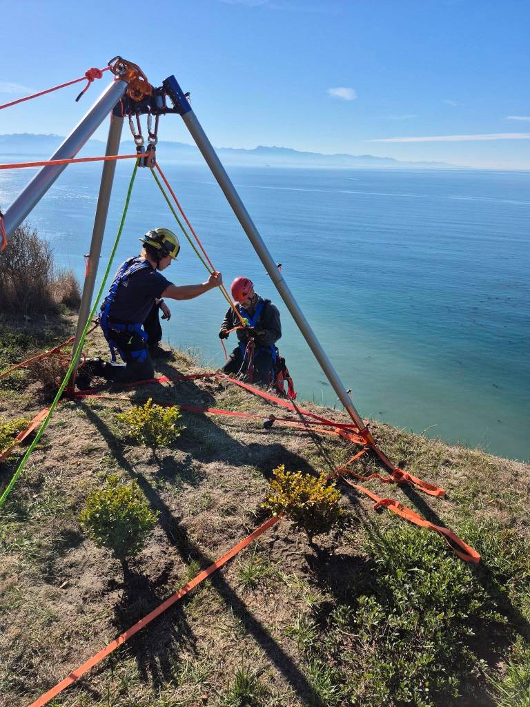 Merrill said only three responders were on site at first, so they called in more people for backup. With assistance from the Navy’s rope technicians, the members of the rescue team were able to conduct the over-embankment mission. A North Whidbey Fire and Rescue captain propelled 100 feet down the cliff to save the furry friend.