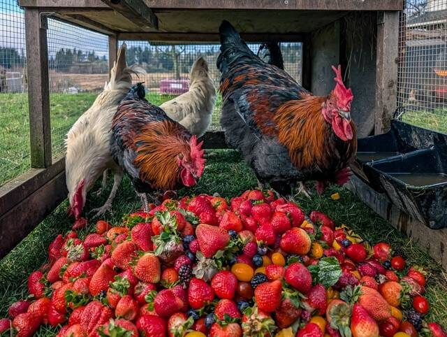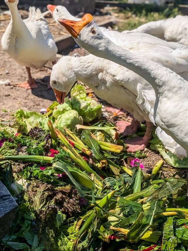 Ducks and chickens feast on ripe berries as brightly colored as gems; goats and geese enjoy lettuce that is only slightly wilted. Once vitamin-deficient waterfowl are now bright-eyed and shiny, while pigs’ teeth are healthy and strong from chomping on large vegetables.