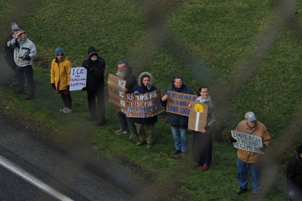 Hundreds rallied peacefully at the intersection of Highway 20 and Main Street on Jan. 30, what became Whidbey’s share of nationwide protests against Immigration and Customs Enforcement. While the deaths of Renee Good and Alex Pretti, shot and killed by federal immigration agents last month, largely motivated people to the streets, Whidbey residents demonstrated for a myriad of additional reasons.