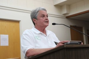 Elks Lodge member Theresa Reed speaks to the Oak Harbor City Council Tuesday. The Elks contracted with the city to run the Whidbey Island Marathon. She plans on being the race director next year.