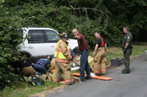 Firefighters work to free a woman trapped underneath an SUV on North Whidbey Friday.