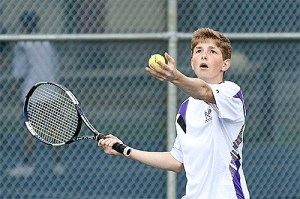 Sid Thomas prepares to serve in his fourth singles win Tuesday.