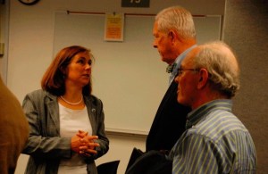 Island County Commissioner Helen Price Johnson speaks with Port of Coupeville Commissioner Marshall Bronson following a recent work session addressing the allotment of conservation futures funds.