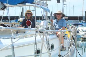 From left, Jackie and Jeffrey Baraban enjoy a sunny day on their boat at the Oak Harbor Marina. The Barabans are among those marina patrons who would consider relocating if moorage rates spike too high.