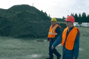 Island Transit executive director Martha Rose and project coordinator Pete Schrum tour the construction site.