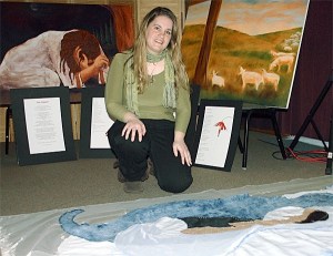 Gina Mammano Vander Kam creates unique art like her fabric piece below. Behind her are paintings by other artists taking part in the Stations of the Cross exhibit at the Pacific Rim Institute.