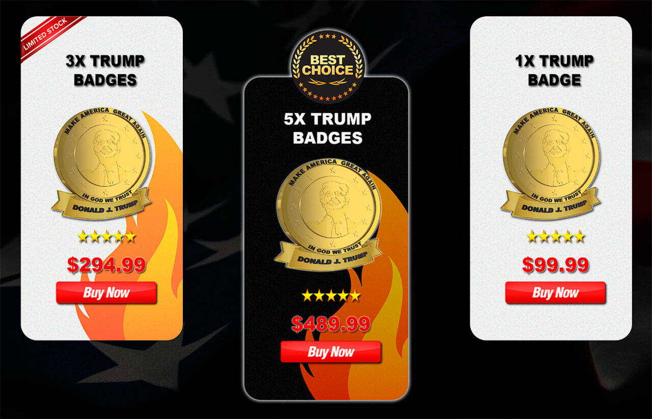 - Three Trump Patriot Badges cost $294.99 each