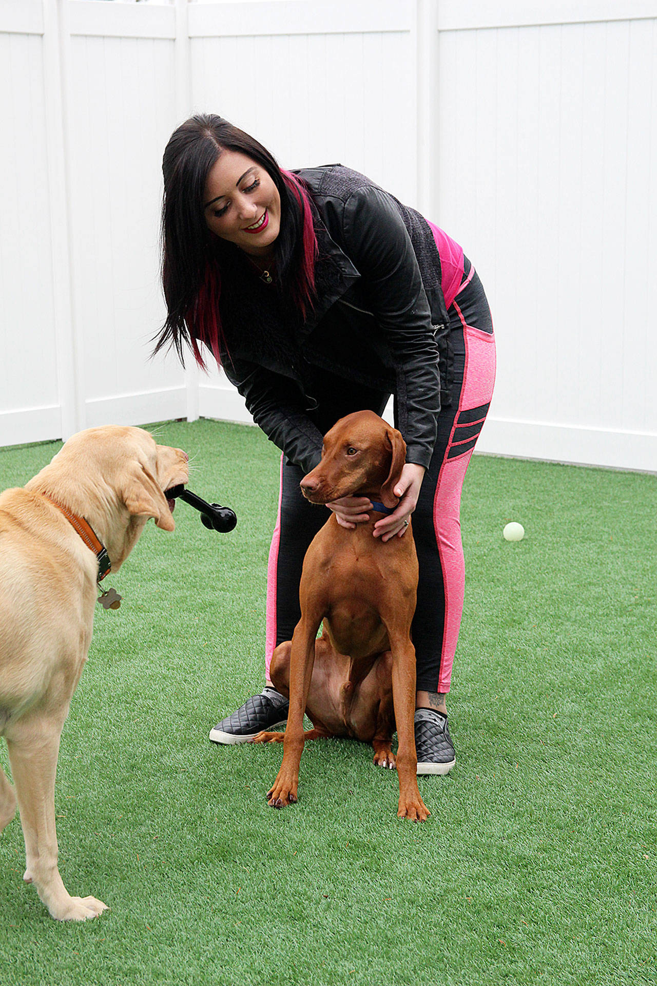 The 6,000 square-foot facility has an open garage door that leads to a 1,200 square-foot “yard.” The green artificial grass has a drain field underneath and is cleaned and sanitized every night, Hall said. There are two cameras outside and one inside that can be remotely accessed by the fur babies’ parents at any time.