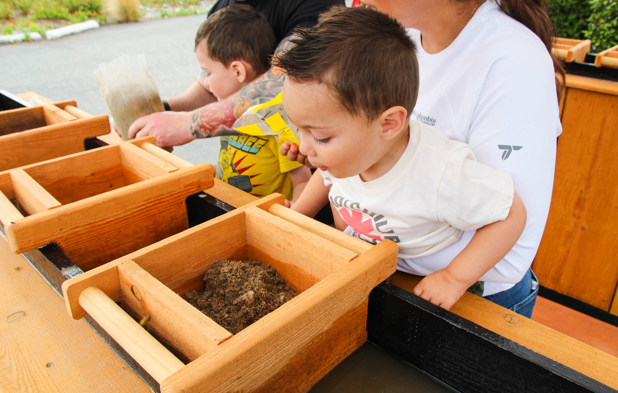 There, the Dunegan family rolled up their sleeves and got to work, pouring some sand from a bag into a sifting box and then shaking it in the sluice box’s water.