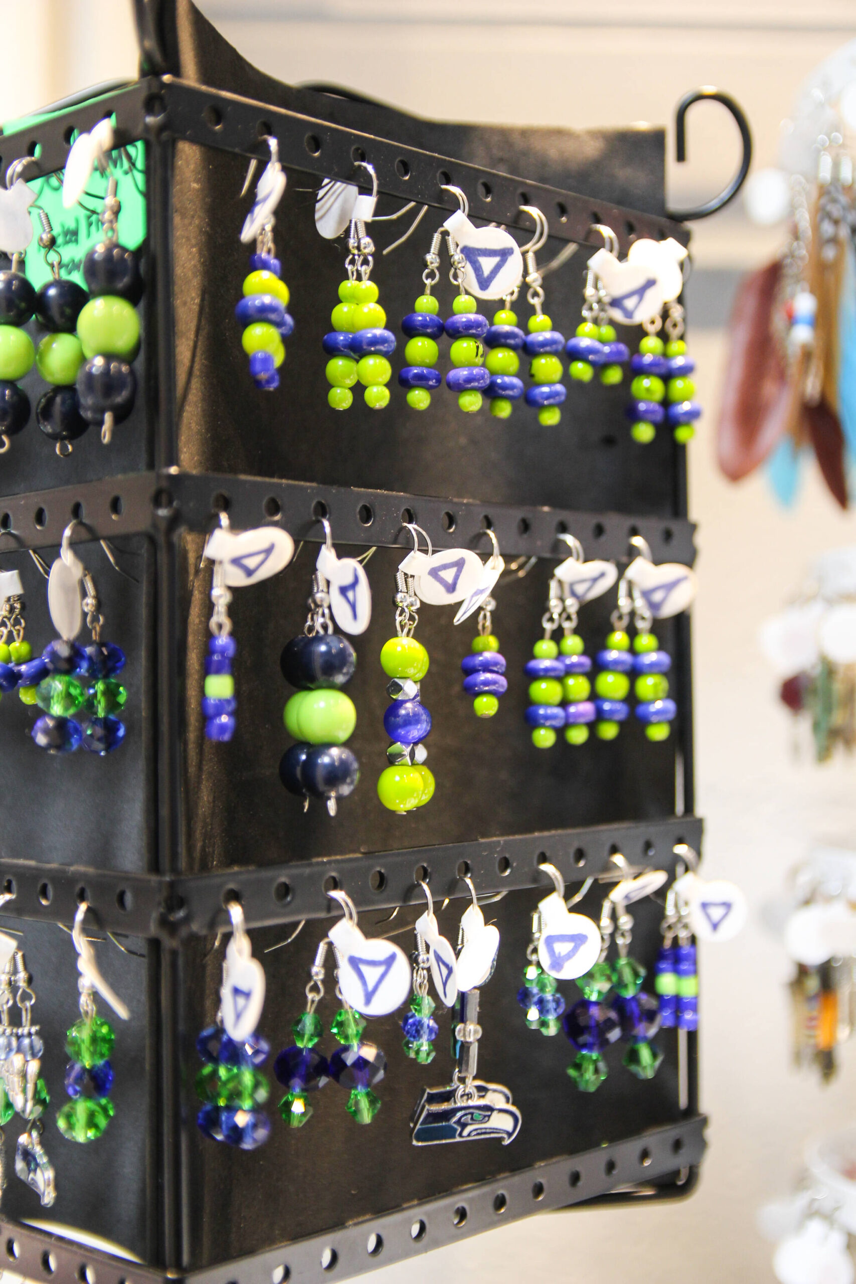 Kathy Larsen is a big fan of her grandson’s creations, proudly wearing a pair of rain cloud earrings on the day of the grand opening.