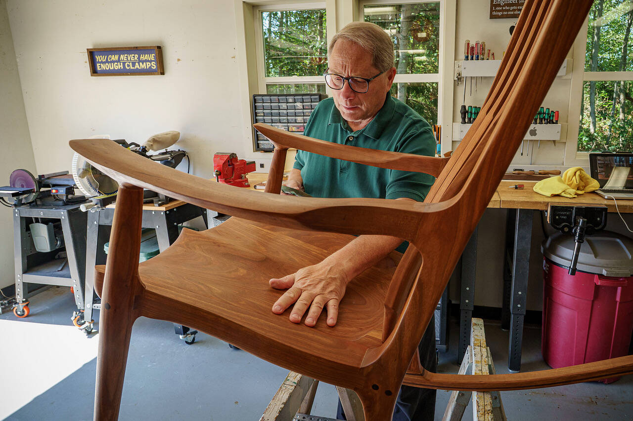 Over near Baby Island, Scott Schmidt is putting the finishing touches on a handsome rocking chair made of cherry with a walnut inlay.