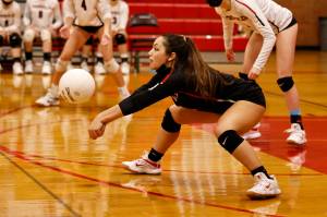 Coupeville junior Alita Blouin passes the ball at a game against South Whidbey High School on Monday, Oct. 27. Blouin had a team-high nine digs during the match, which South Whidbey won 3-0 with scores of 25-21, 25-8 and 25-18.