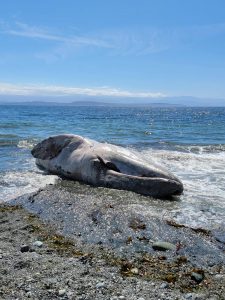 The body of a 40-foot-long adult female gray whale beached on Ebey’s Landing Monday.