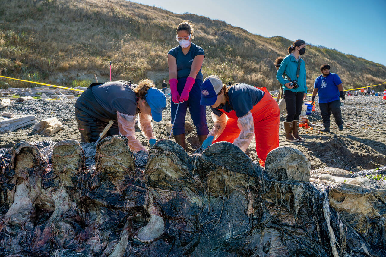 The whale was a mass of bones with blubber hanging off in blobs by Friday morning. It was slimy and covered in rocks and sand. A volunteer described the carcass as “soupy,” as remnants oozed out of it onto the sand. Yet the overpowering odor of the prodigious cadaver had diminished from weeks earlier.