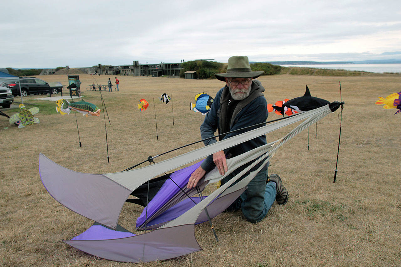 Dick Barnes, known as a master kite maker, works on a ground display at Fort Casey on Saturday Sept. 7.