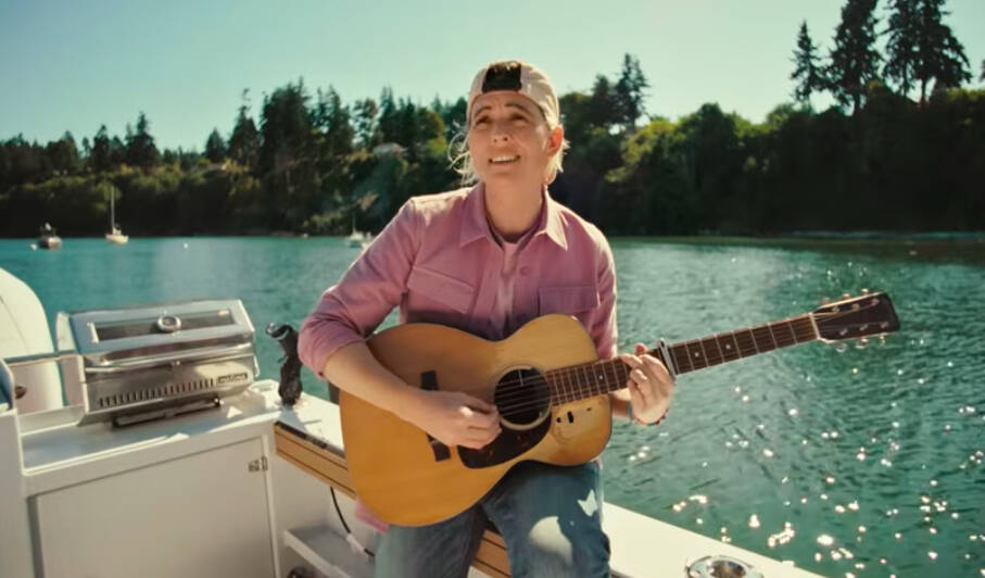 The video features the Emmy- and Grammy-winning artist strumming her guitar and boasting a backwards cap as she fishes, with lush green forests and teal island waters behind her. In between shots, the camera pans to a spotted seal on a dock, a bird flying across a bay, among other iconic Whidbey shots and, of course, Carlile’s fishing hook and net.