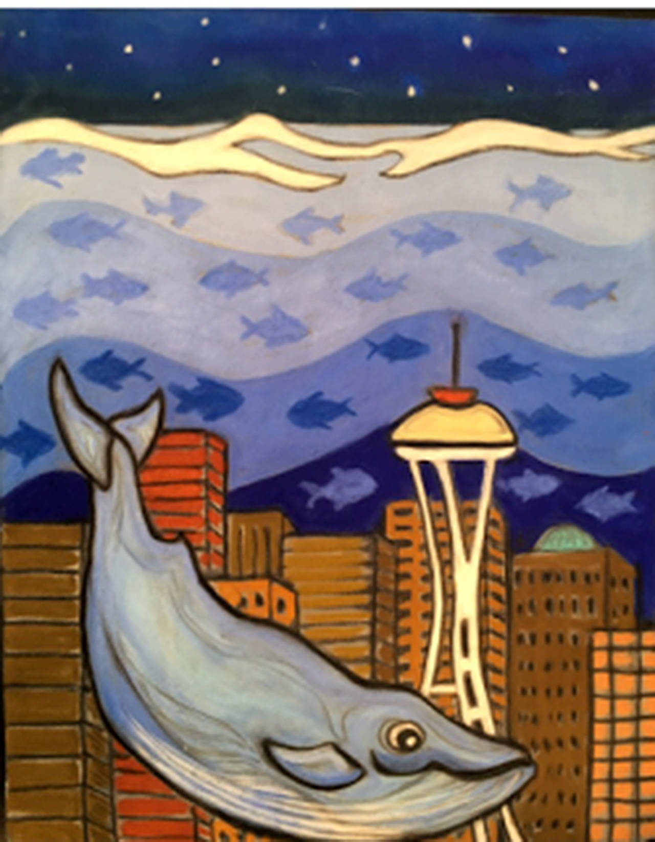 Set to the cadence of “‘Twas the Night Before Christmas,” the story tells how sea creatures rejoice because “the earth will be ours/the sea will be vast/and man will be gone/ from our lives at last.” One drawing shows a gray whale circling Seattle’s Space Needle that’s sunk into Puget Sound.