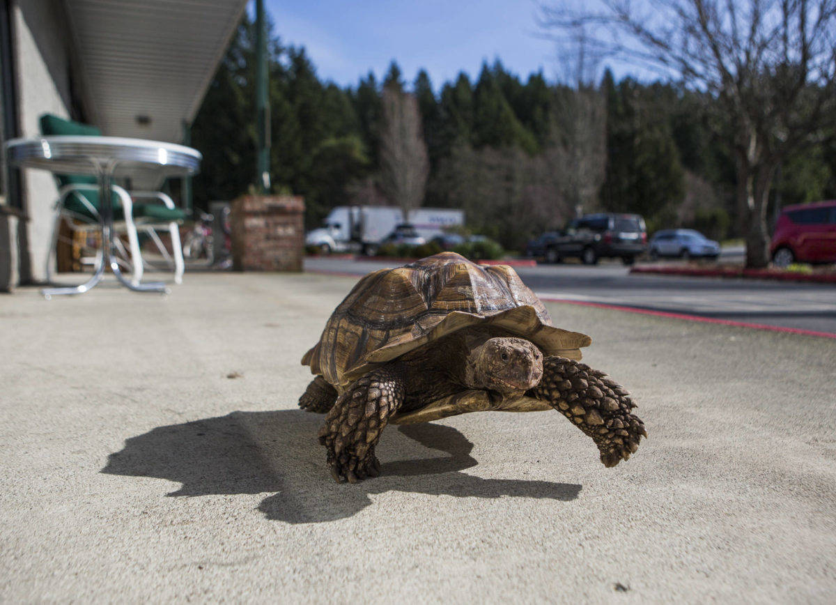 The 45-pound sulcata tortoise lives at Critters & Company Pet Center, an essential business in the pandemic scheme of things.