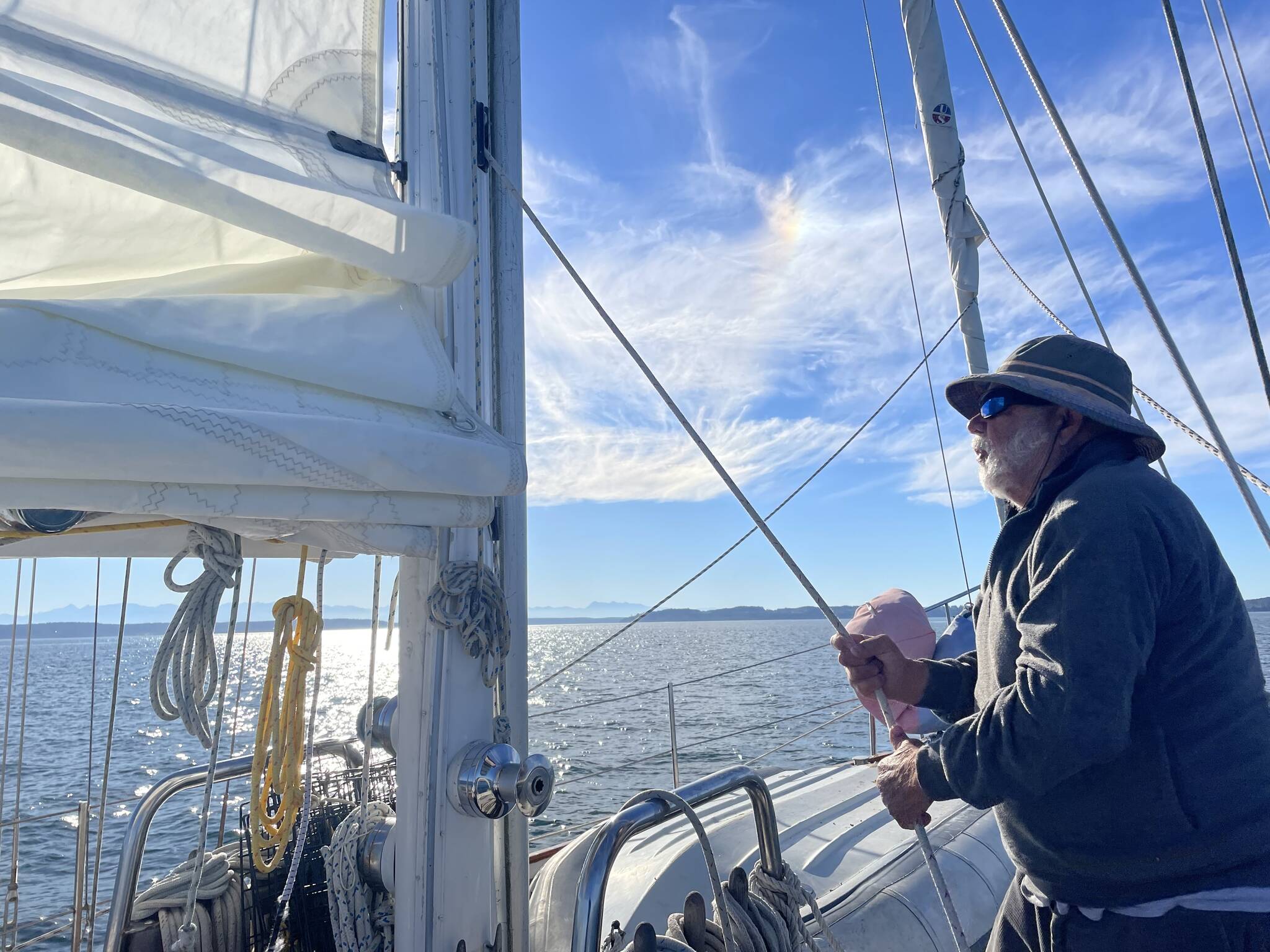 We launched from a dinghy on Good Beach, a private beach in Coupeville. Smith rowed us across the short stretch to where the Culmination was anchored. It was a beautiful day on the cusp of autumn. The Penn Cove waves shimmered under a soft morning breeze. The scoter ducks tap danced on the waves and jellyfish speckled the water, pulsing beneath our boat.