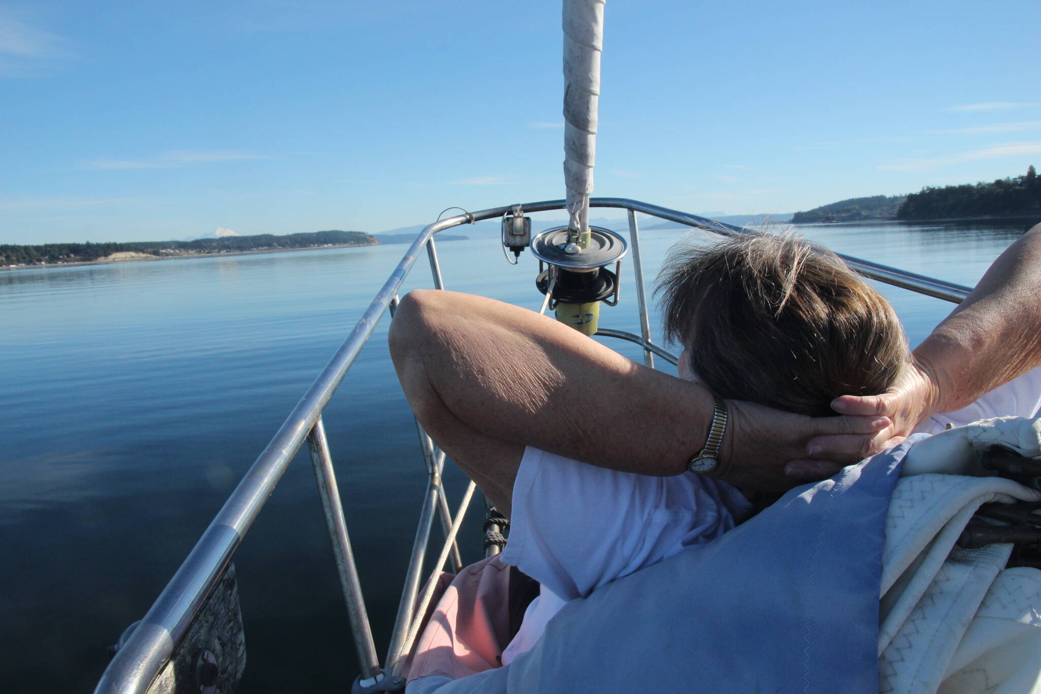 (Photo by Marina Blatt) Holderman relaxes at the bow of the boat on a makeshift chair made out of a rolled-up sail