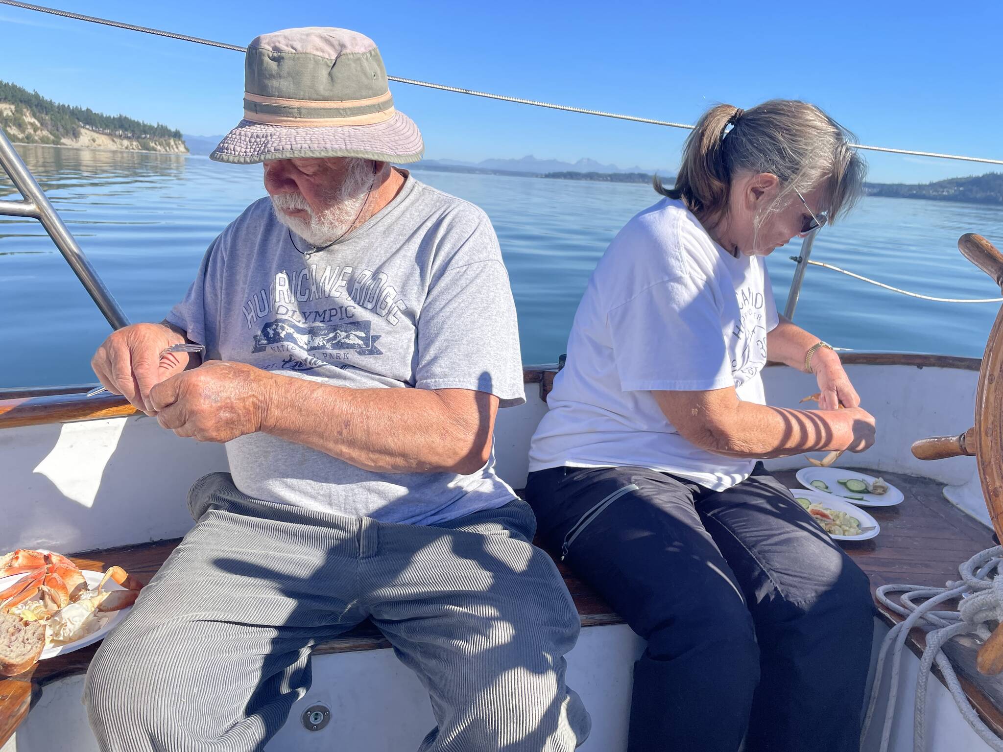 (Photo by Marina Blatt) Bill Smith and Carla Holderman feast on crab legs and soak in the sun aboard Bill’s boat, the Culmination.