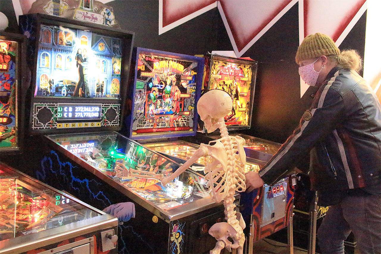 Photo by Kira Erickson/Whidbey News-Times Tim Leonard plays a round of pinball with a skeletal friend in the Machine Shop.