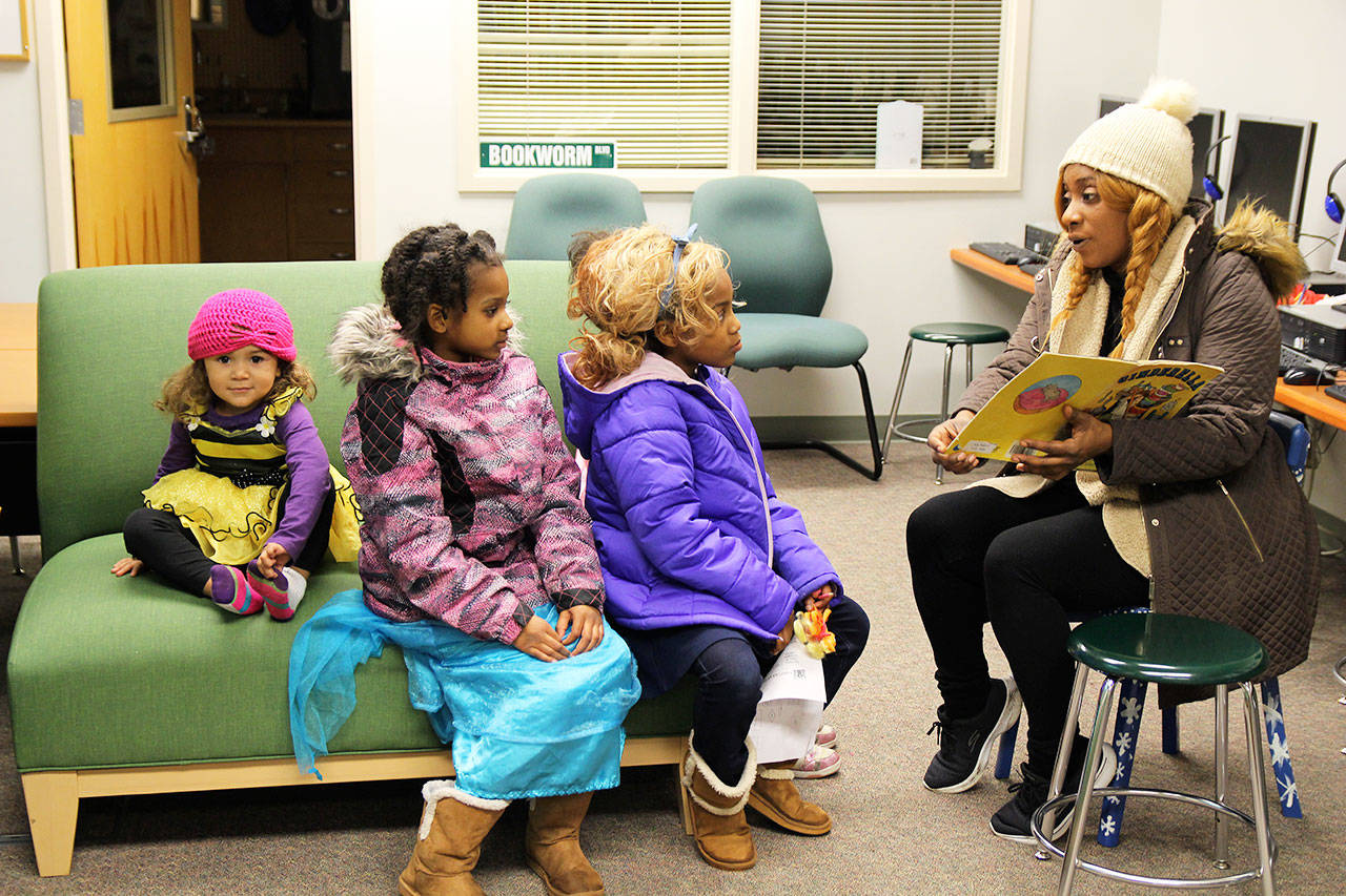 Lelia Brown reads to (from left) Faith, Chanel and Aubrey Brown during Broad View Elementary School’s Literacy Night Thursday. Students and teachers were encouraged to dress up to match the fairy tale theme of the evening. Photo by Laura Guido/Whidbey News-Times