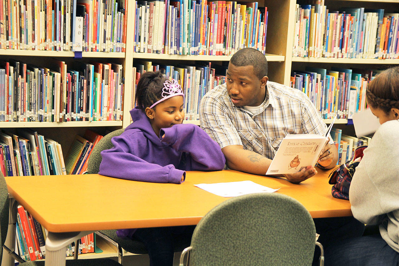Madyson White listens to her dad Ray read a version of Cinderella Thursday at Broad View Elementary’s Literacy Night. The event aimed to facilitate parents’ involvement in their child’s education and promote reading among the students. Photo by Laura Guido/Whidbey News-Times