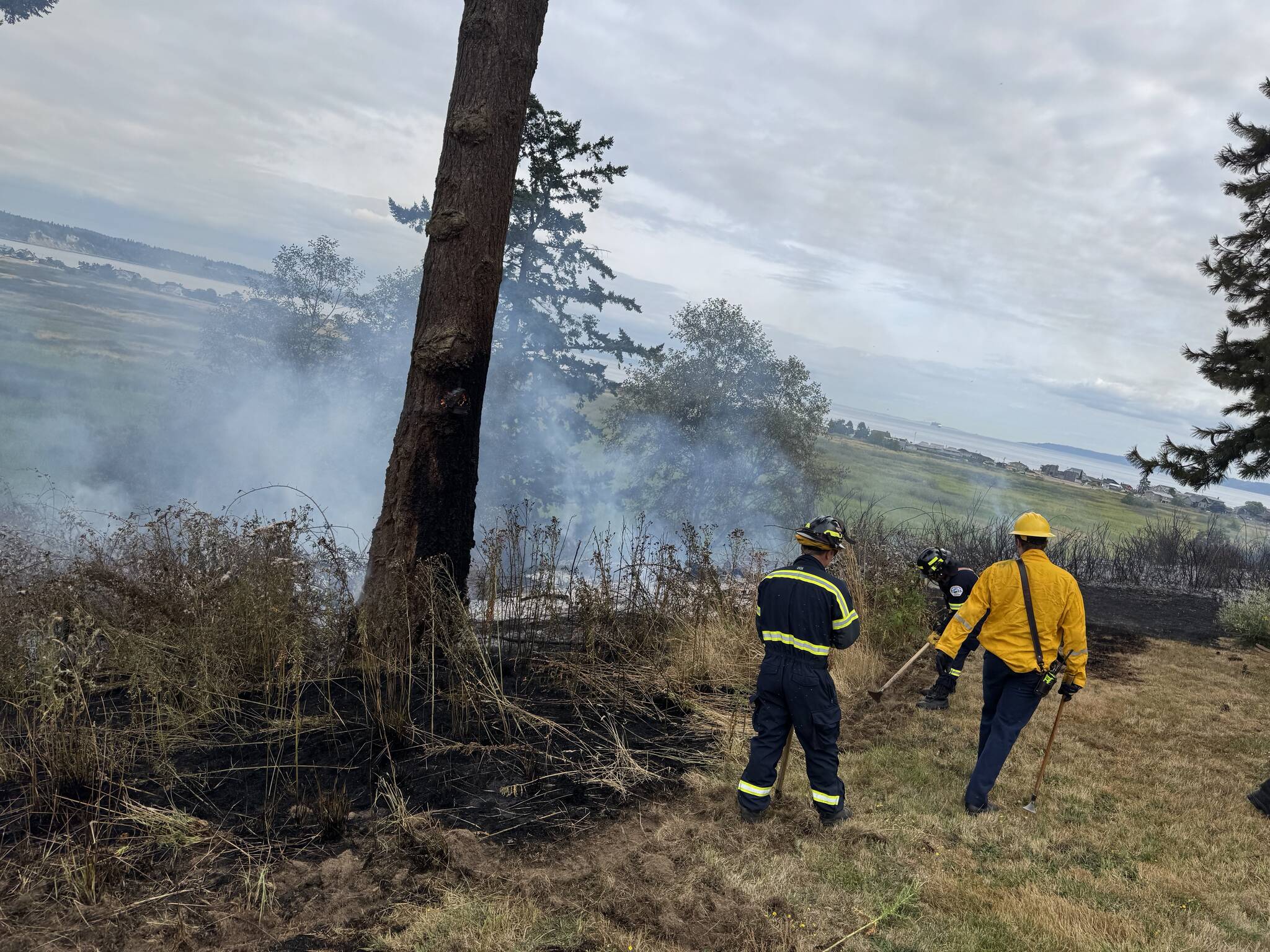 The Department of Natural Resources brought a helicopter to the scene to assist in the response. Nearby personnel from Central Whidbey Island Fire and Rescue also helped. Puget Sound Energy workers shut off power to the surrounding area for about two hours. Double Bluff Road was closed for about three hours until 7 p.m., Magallon said.
