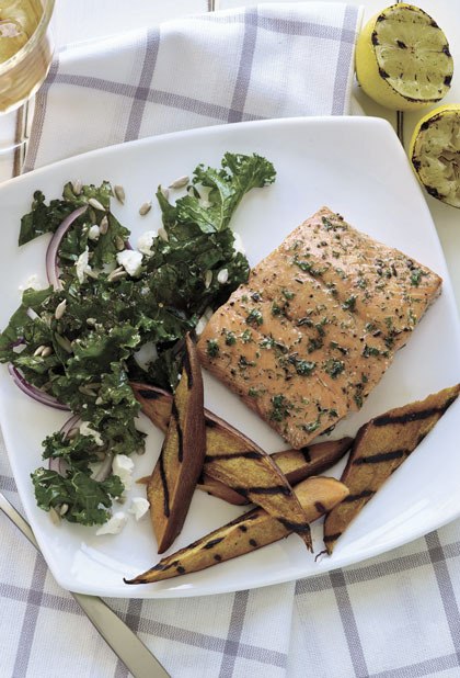 Cedar Plank Grilled Salmon with Sweet Potatoes