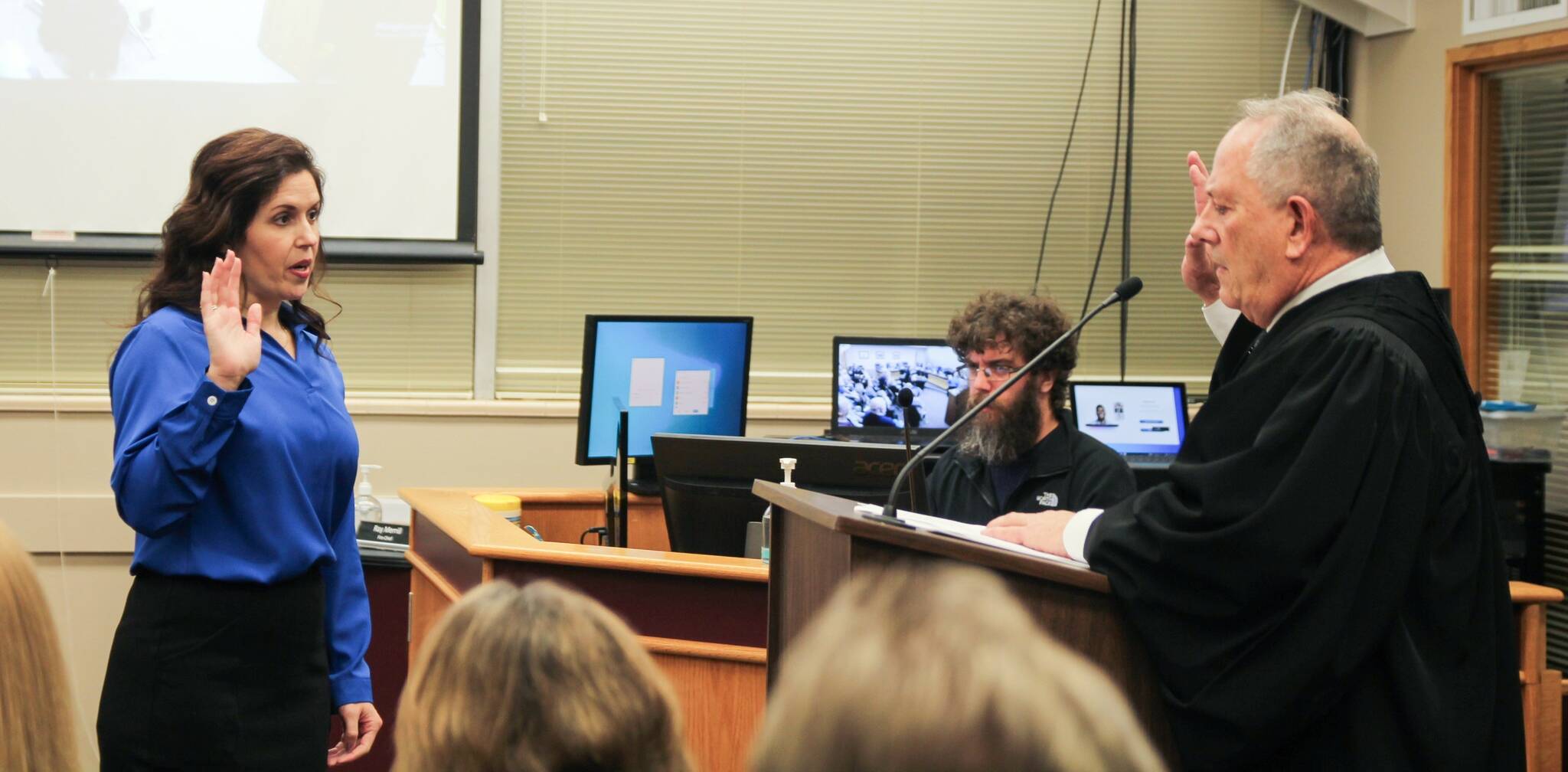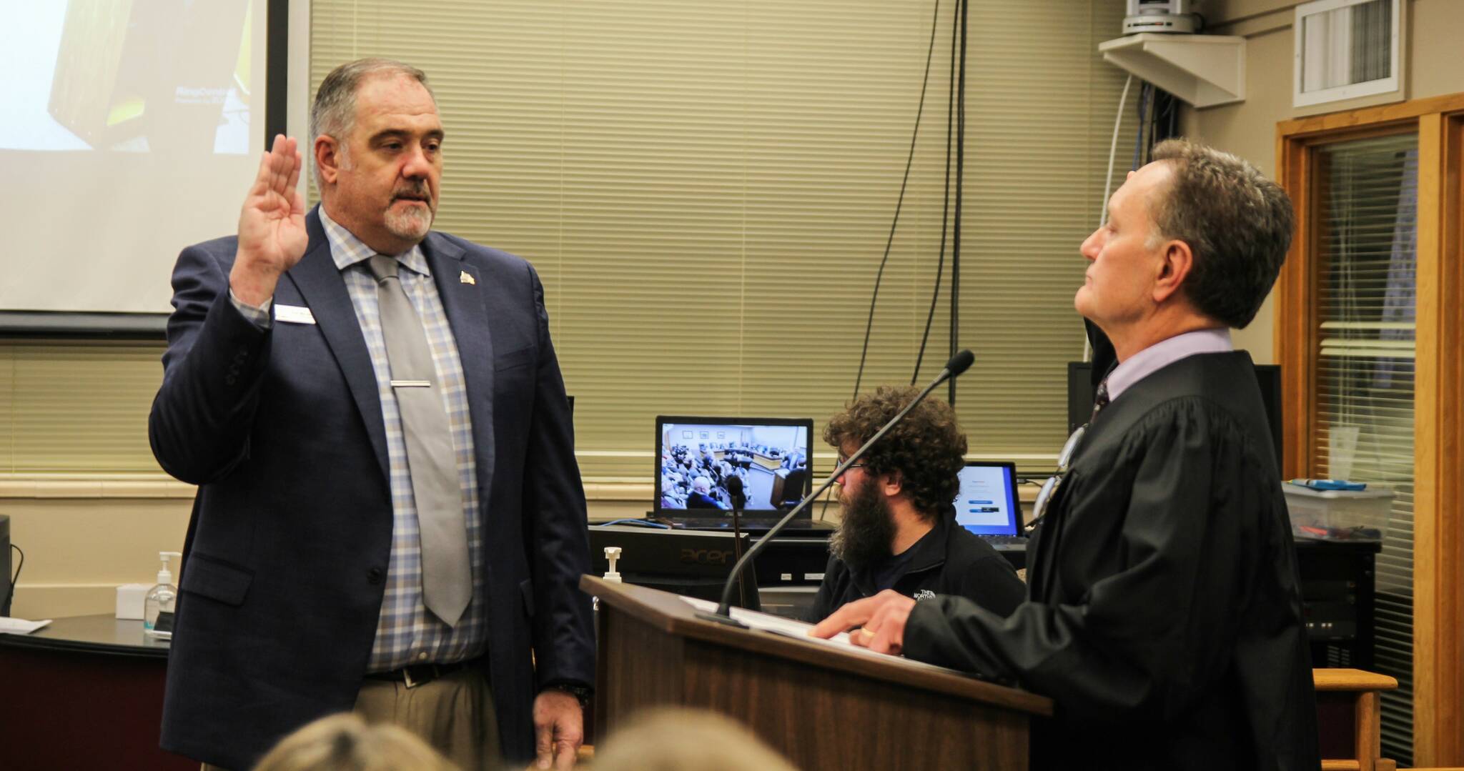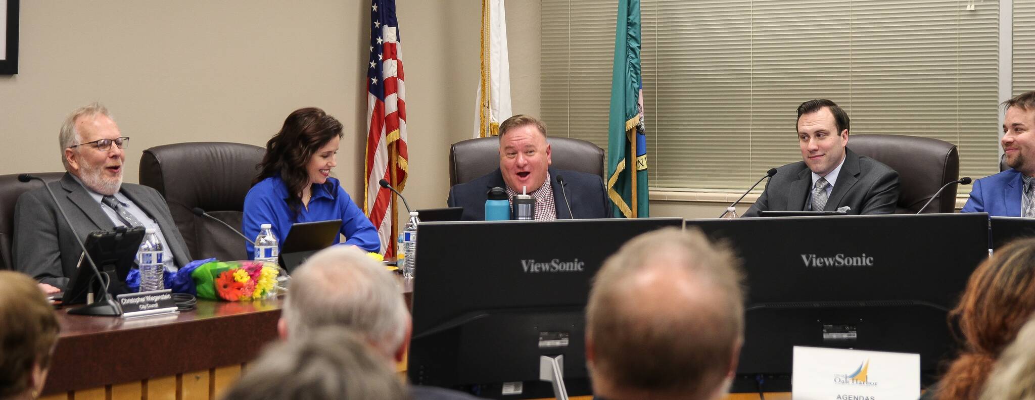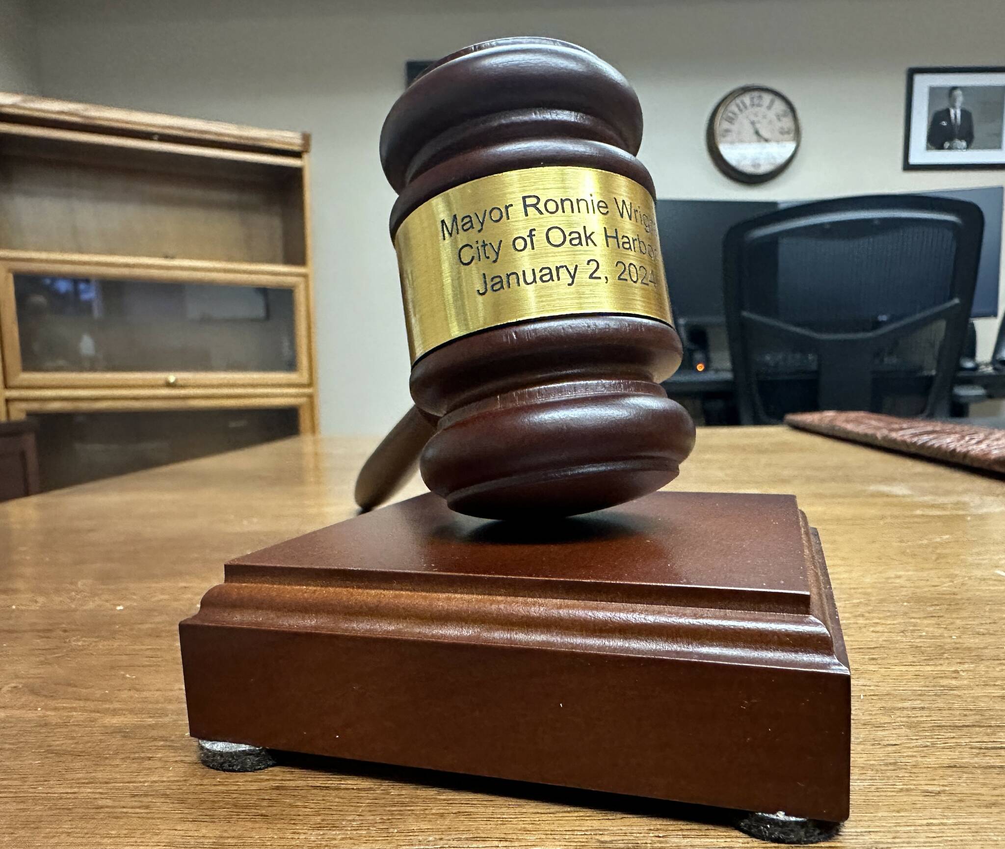 This was Ronnie Wright’s first city council meeting, which began with District Court Judge William Hawkins swearing him in as the new mayor of Oak Harbor as the crowd erupted in cheers.