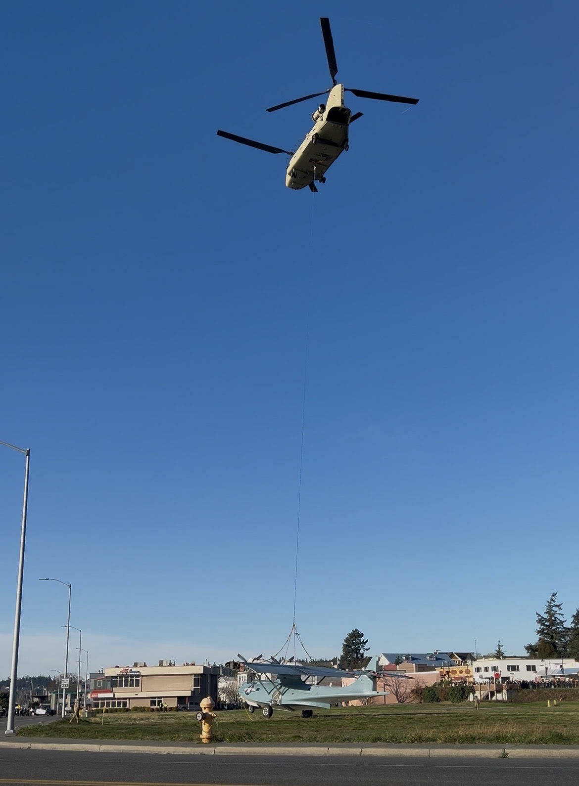 A Chinook helicopter from the Washington Army National Guard was supposed to airlift the Pacific Northwest Naval Air Museum’s approximately 83-year-old PBY-5a Catalina, in the museum’s possession since 2010, from downtown Oak Harbor to its new home on Ault Field Road.