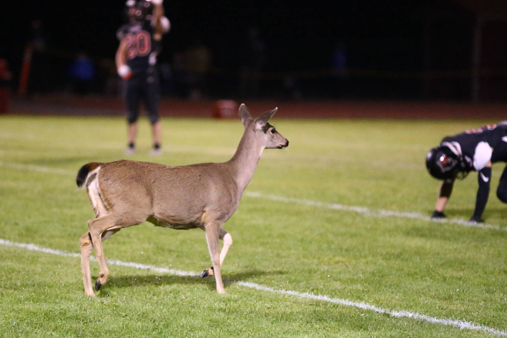 Nevertheless, Friday’s event was still an unexpected and exciting occurrence. Coupeville High School Athletic Director Willie Smith said the teams were just lining up before a play when the deer approached from the end zone and meandered onto the field.