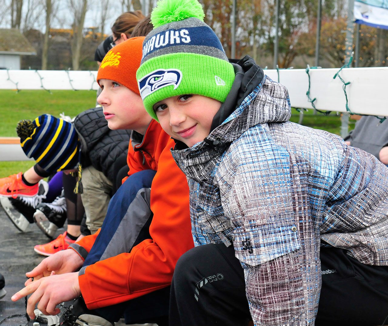 Trinity Krouse and friend Kaytee Lockwood, both dancers at Whidbey Island Dance Theater, found it hard to be graceful with skates on the slippery surface, but they agreed they were having a lot of fun. They were there to support each other on the ice — literally.