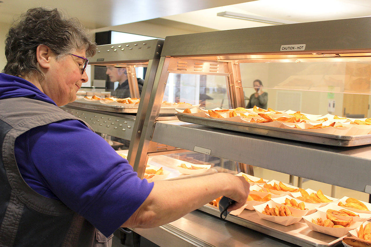 Sally Waters opens one of many oven doors inside the cafeteria kitchen of Oak Harbor High School, pokes in her food thermometer and checks the temperature. Good and hot.