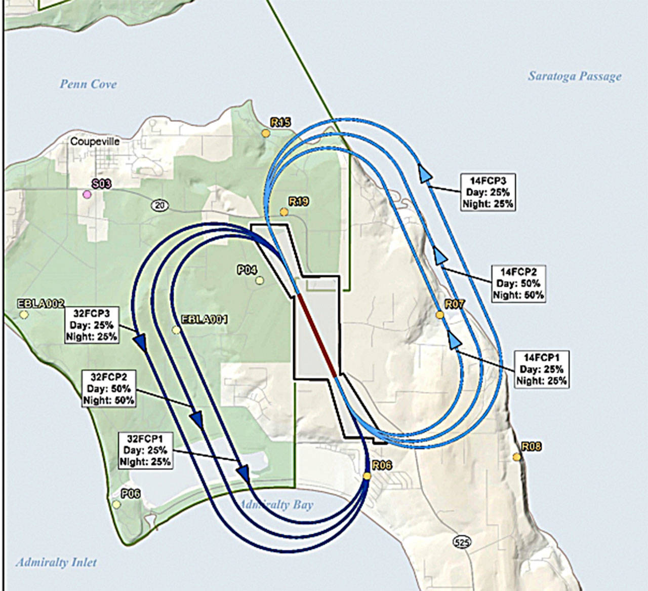 The idea that the aircraft are flying outside of their designated path, however, might be based on a misunderstanding, an official at Naval Air Station Whidbey Island indicated. Many factors can affect the flight track of the Growlers as they circle Outlying Field Coupeville during aircraft carrier landing practice.