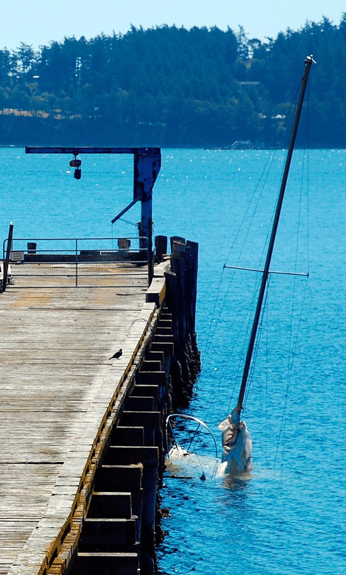 After being taken for a ride by three would-be mariners, a sailboat that had been beached at Grasser’s Lagoon for months is now sunk beside the Penn Cove Pier.
