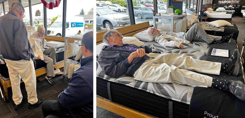 Bob and Gaile Ade testing the height and comfort of beds at ESC Mattress Center in Everett. Photo courtesy ESC Mattress Center.