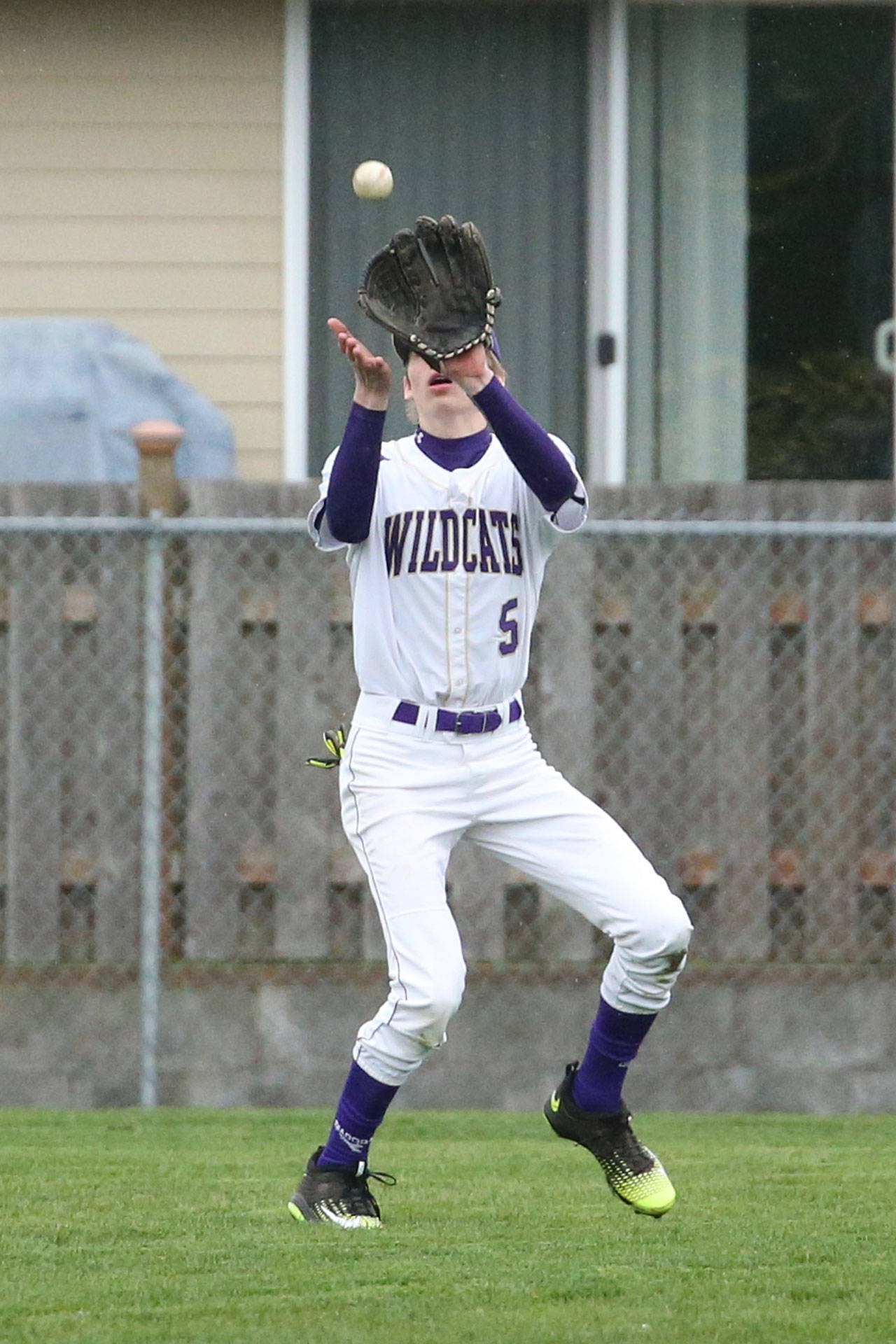 Oak Harbor left fielder Will Danielson looks in a fly ball. (Photo by John Fisken)