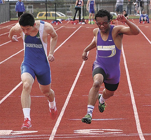 The Oak Harbor and Shorewood High School track teams split a pair of close meets Thursday, April 10, at Wildcat Memorial Stadium.